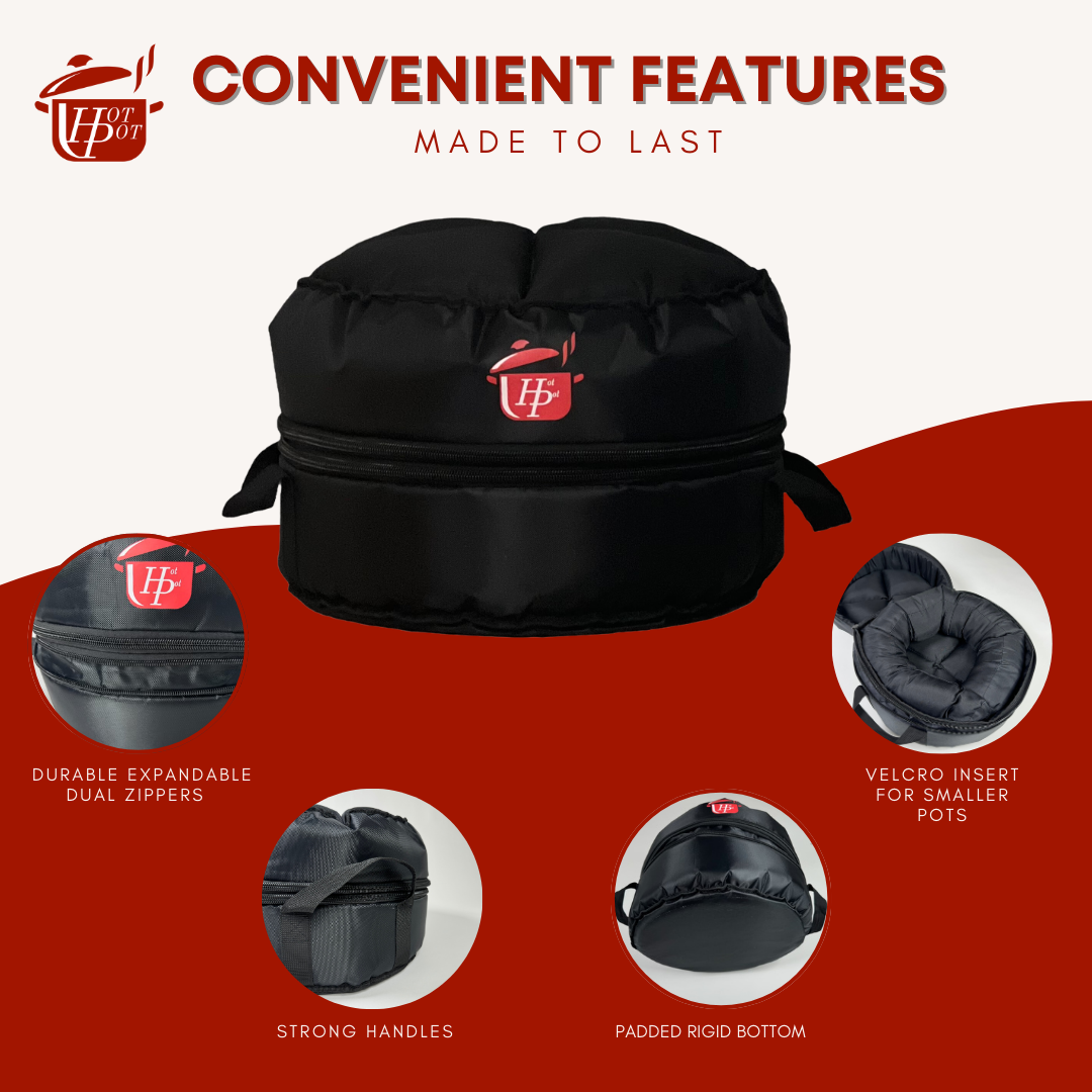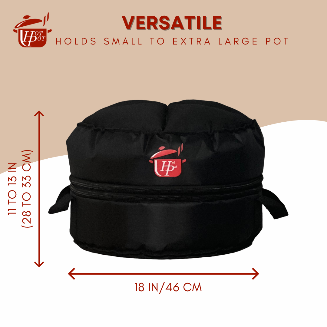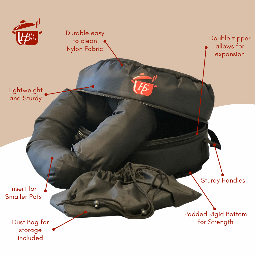Hotpot -A thermal fabric insulator designed for pots ranging from small to extra-large. A modern design keeps your food hot for hours and your cold dishes chilled. Perfect for home, travel, picnics, and entertaining and more.